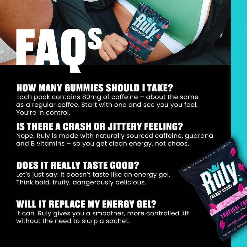 Ruly candy is crafted by top European confectioners and powered by proven ingredients. Ingredients backed by 100+ studies, clinically effective doses of caffeine + B vitamins.