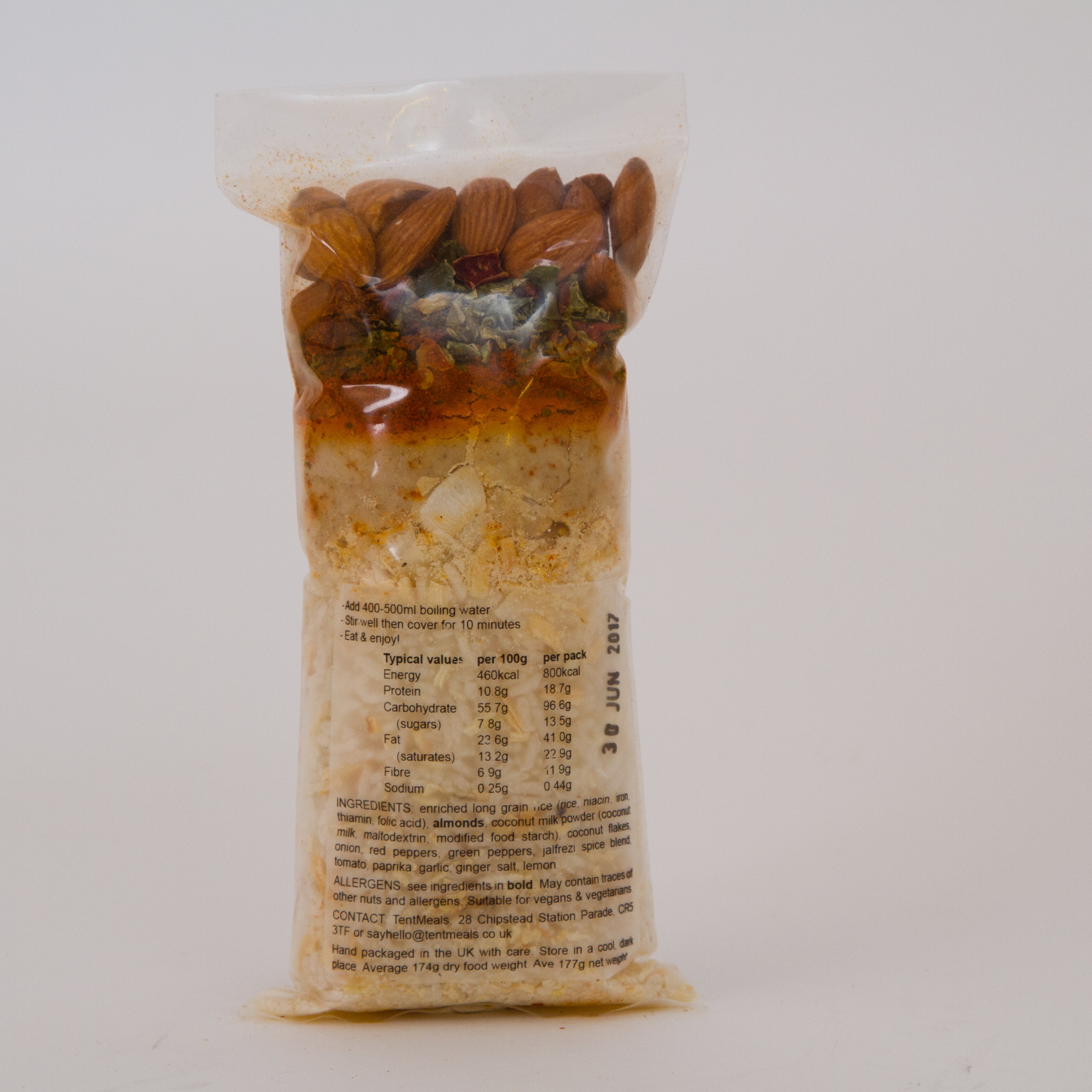 Ingredients: enriched long grain rice (rice, niacin, iron, thiamin, folic acid),almonds, coconut milk powder (coconut milk, maltodextrin, modified food starch), coconut flakes, onion, red peppers, green peppers, jalfrezi spice blend, tomato, paprika, garlic, ginger, salt, lemon.