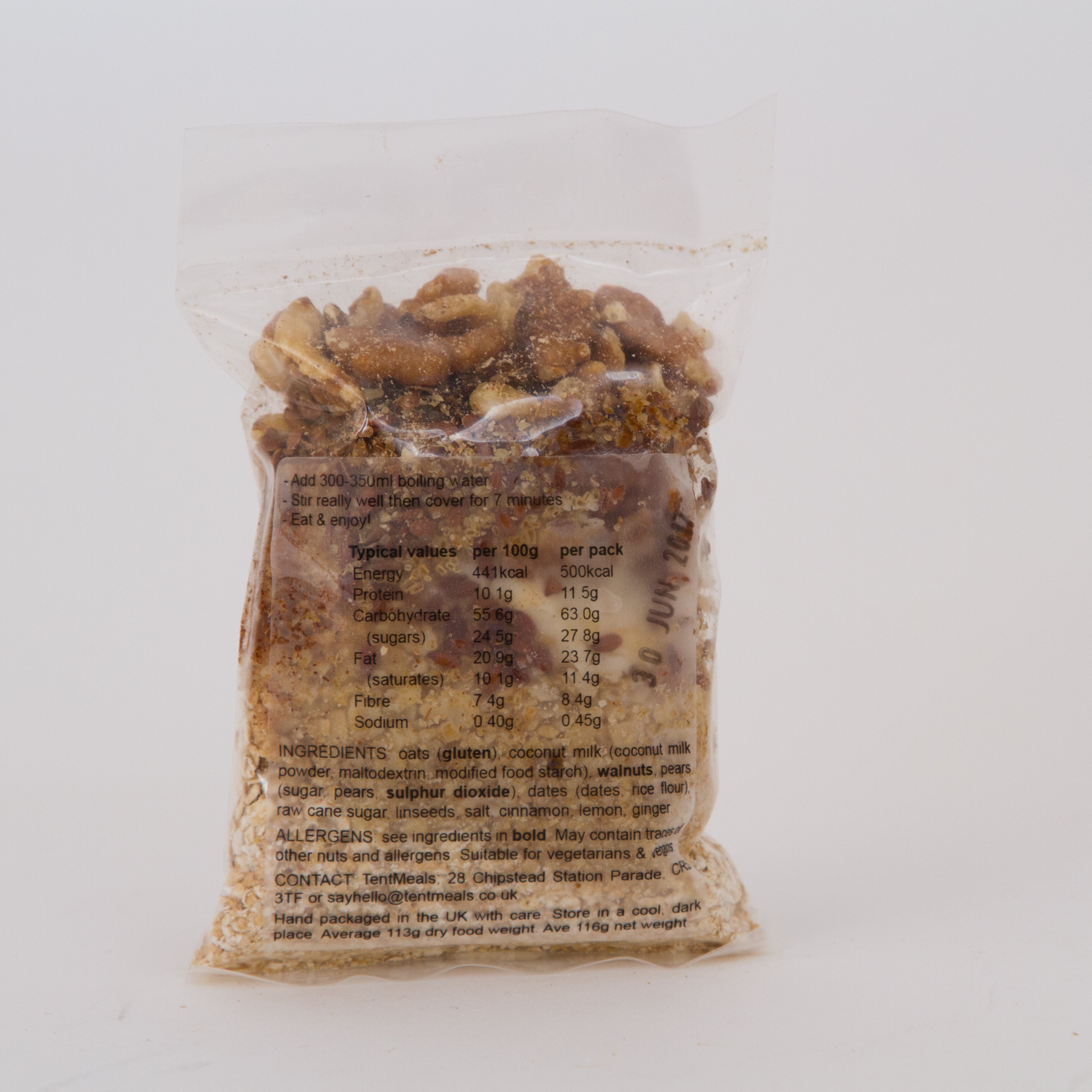 Ingredients: Oats (gluten), coconut milk (coconut milk powder, maltodextrin, modified food starch), walnuts, pears (pears, sulphur dioxide), dates (dates, rice flour), raw cane sugar, linseeds, salt, cinnamon, lemon, ginger.
