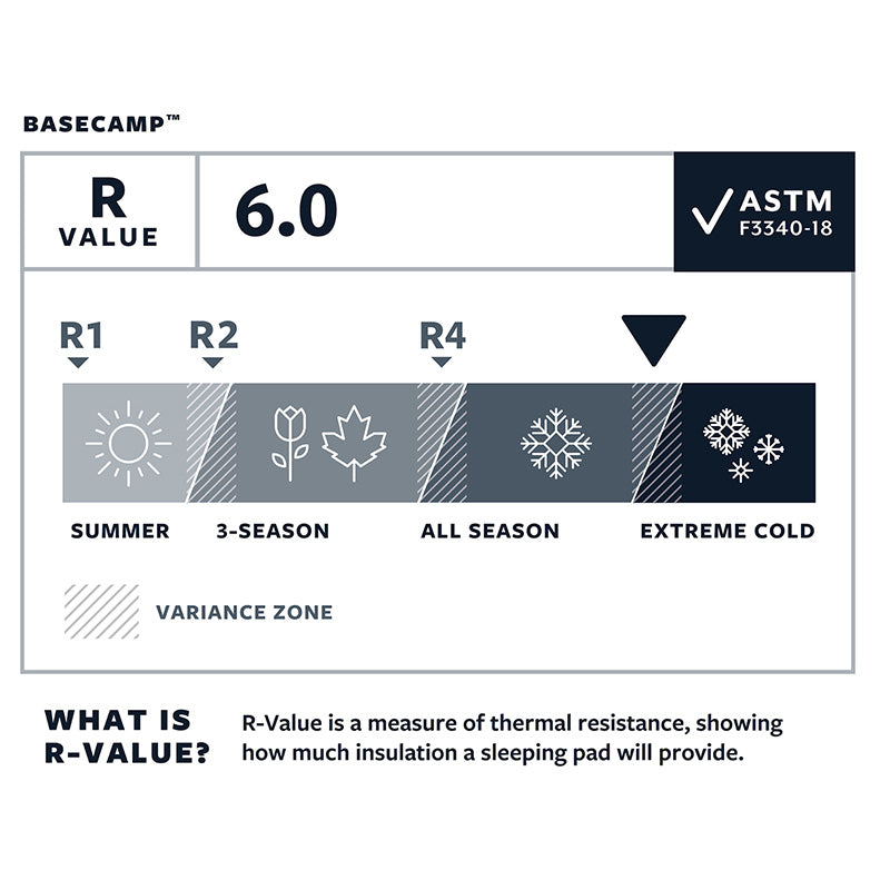The Therm-A-Rest BaseCamp is available in sizes Regular, Large and Extra Large. They all come with Therm-A-Rest's high performance WingLock valve to help the self-inflating pad quickly and effortlessly inflate.