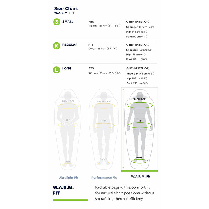 - W.A.R.M. Fit: With Additional Room for Multiple positions (W.A.R.M.) fit means this bag allows for various natural sleep positions while maintaining thermal efficiency.