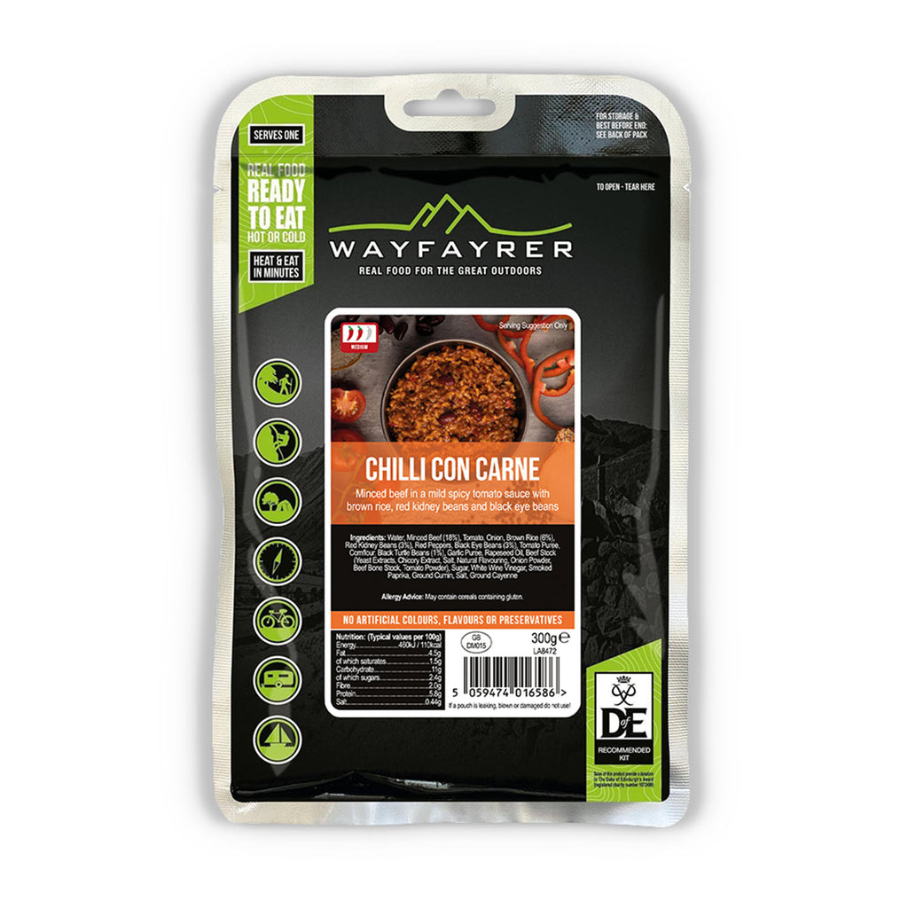 Hearty chilli con carne featuring minced beef in a bold, spicy tomato sauce combined with nutritious brown rice, red kidney beans and black eye beans. This 300g ready-to-eat meal requires no refrigeration, making it perfect for camping, hiking, climbing and outdoor adventures. Enjoy it straight from the pouch or heat for enhanced flavour—simply warm in boiling water for 7-8 minutes or on your stove. Lightweight, shelf-stable and satisfying, it's an ideal companion for any expedition.